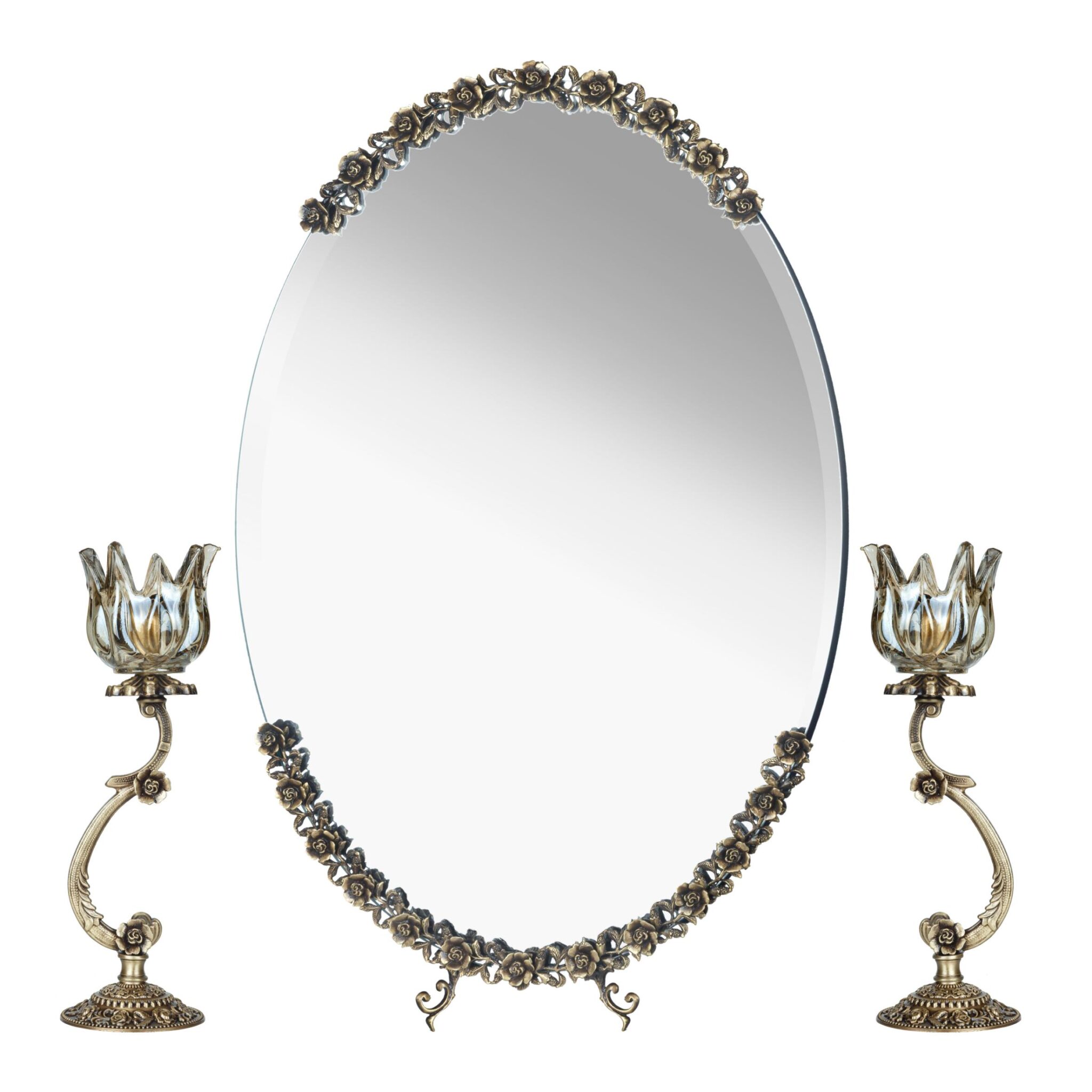 آینه و شمعدان چشمه نور کد A8080/50×۴۰ آنتیک شامل یک عدد آینه بسیار با کیفیت بیضی شکل و دو عدد شمعدان فلزی با آبکاری آنتیک می باشد.