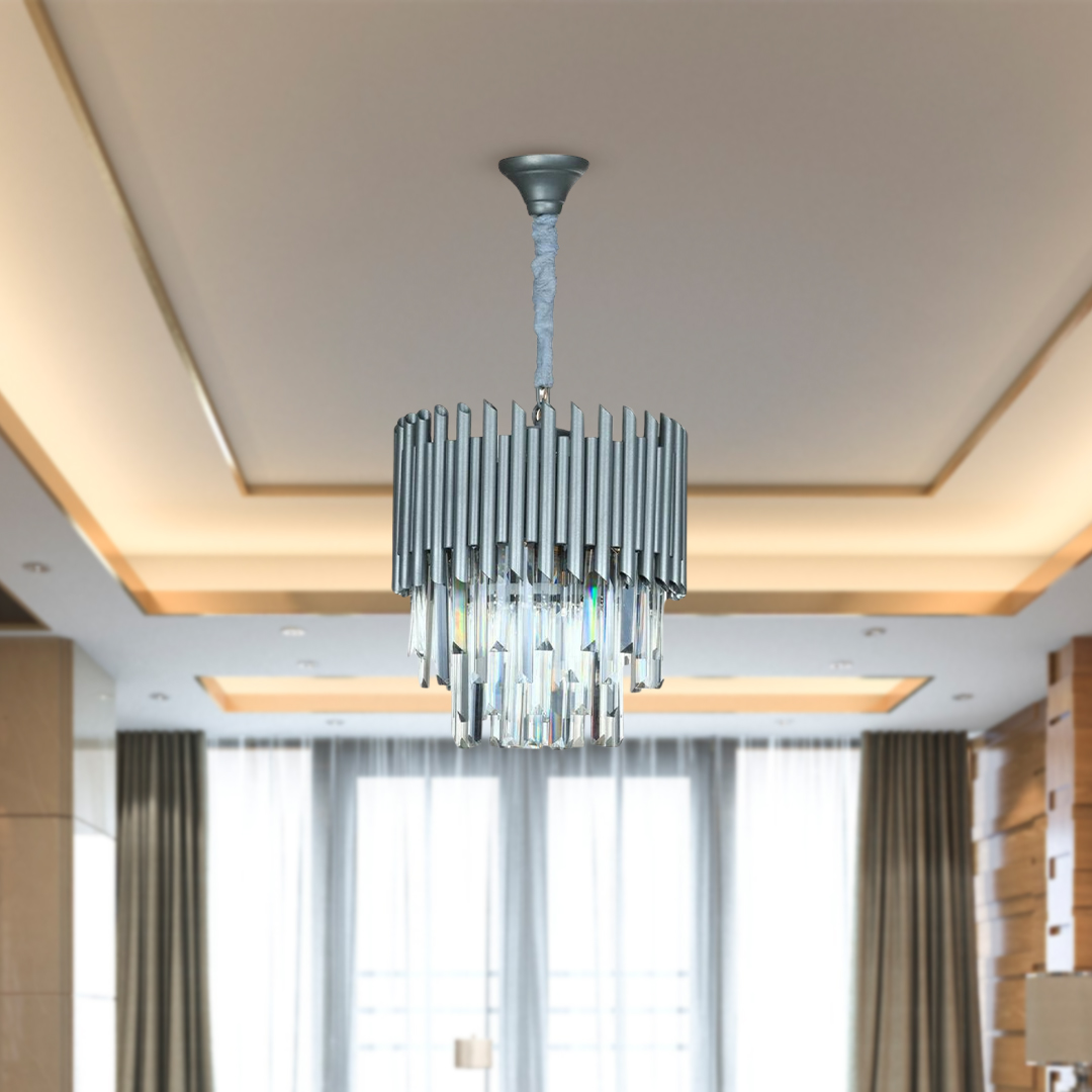 لوستر آویز چشمه نور کد MO4424/30T طوسی یک لوستر شیک به سبک نئوکلاسیک است که میتوان از آن در فضاهای مسکونی و اداری استفاده کرد. طراح این لوستر با ترکیب المانهای طراحی مربوط به سبک مدرن مانند خطوط شکسته در کنار اجزای کریستالی که نماینده سبک کلاسیک هستند، دست به طراحی و خلق یک لوستر نئوکلاسیک زده است.