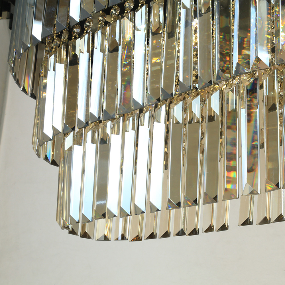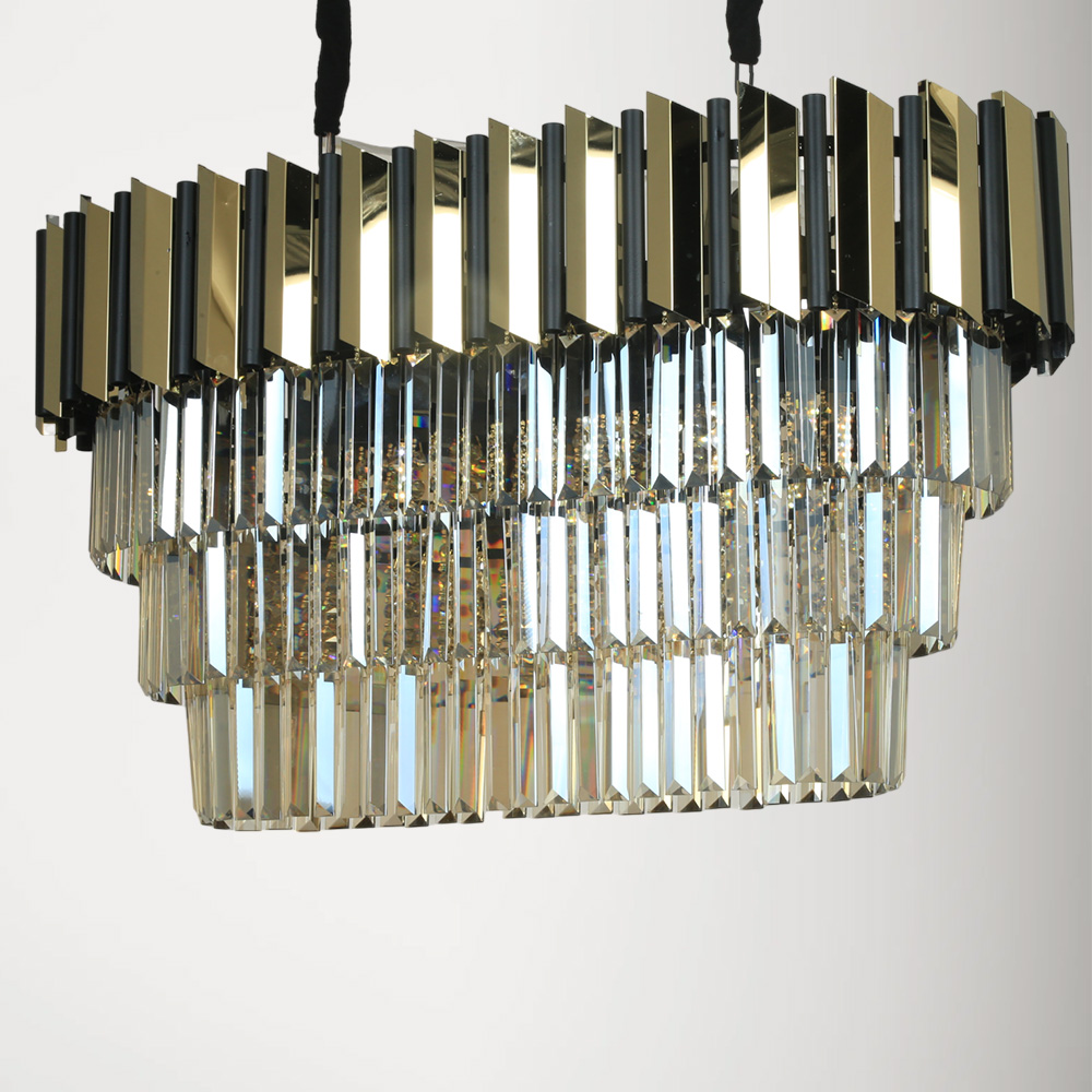 کریستال های شامپاینی نوری گرم ایجاد کرده و انعکاس این نور بر روی سطح فلزی پوشیده شده با آبکاری طلایی همچنین فرم مستطیلی این لوستر ، نوردهی این محصول را بیشتر می کند ، به طوری که لوستر لاینر چشمه نور کد N2417/70 طلایی مشکی با کریستال ، به تنهایی ۲۰ متر مربع از فضا را برای شما روشن می کند.