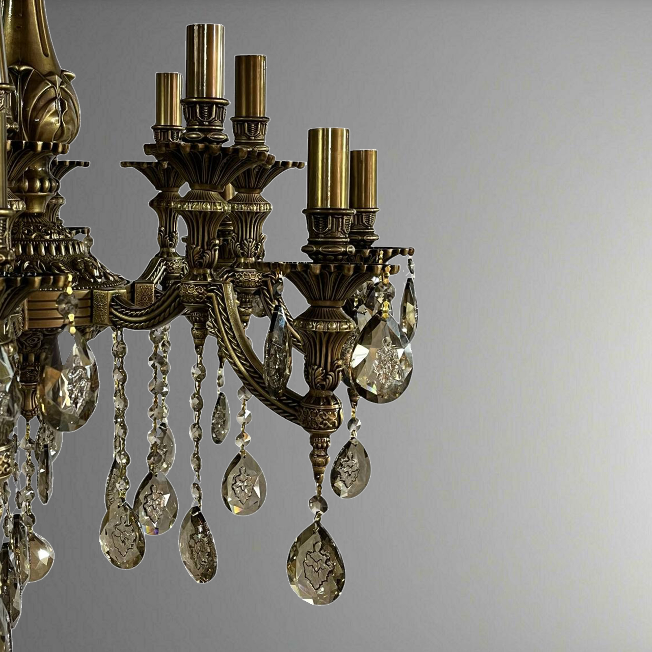 لوستر ۱۶ شعله چشمه نور کد E4908/8A با آبکاری آنتیک، یک شاهکار هنری است، که طراحی دقیق و ظریف آن، جزئیات کلاسیک را به نمایش میگذارد. بدنهی برنجی با رنگ آنتیک، حس گرما و صمیمیت را به محیط میبخشد. شاخههای لوستر، با طراحی زیبا و متقارن، به گونهای قرار گرفتهاند که نور را به طور یکنواخت و دلپذیر در فضا پخش میکنند. جزئیات ظریف قلمکاری شده، نمادی از تاریخ و فرهنگ غنی است که شکوه و اصالت را به نمایش می گذارد. آویزهای بلورین که به زیبایی از بدنه آویزان شدهاند، با هر بار تابش نور، جلوهای خیرهکننده و درخشان ایجاد میکنند. این بلورها مانند قطرات باران در آفتاب میدرخشند و با ایجاد سایههای زیبا بر روی دیوارها و سقف، فضایی جادویی و رویایی را به وجود میآورند. قطر این لوستر برنجی ۸ شاخه ۶۸ و ارتفاع آن ۸۷ سانتیمتر است و وزنی برابر با ۸/۲۰۰ کیلوگرم دارد. دارای ۱۶ عدد سرپیچ E14 است و مناسب فضاهایی با متراژ ۱۲ تا ۴۰ متر میباشد. این لوستر ۱۶ شعله مناسب منازلی با دکوراسیون سنتی و کلاسیک و فضاهایی مانند تالار، هتل و رستوران است.