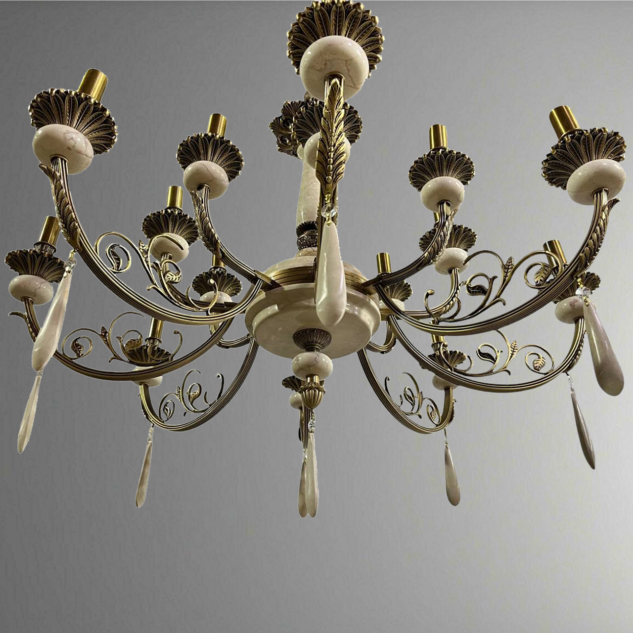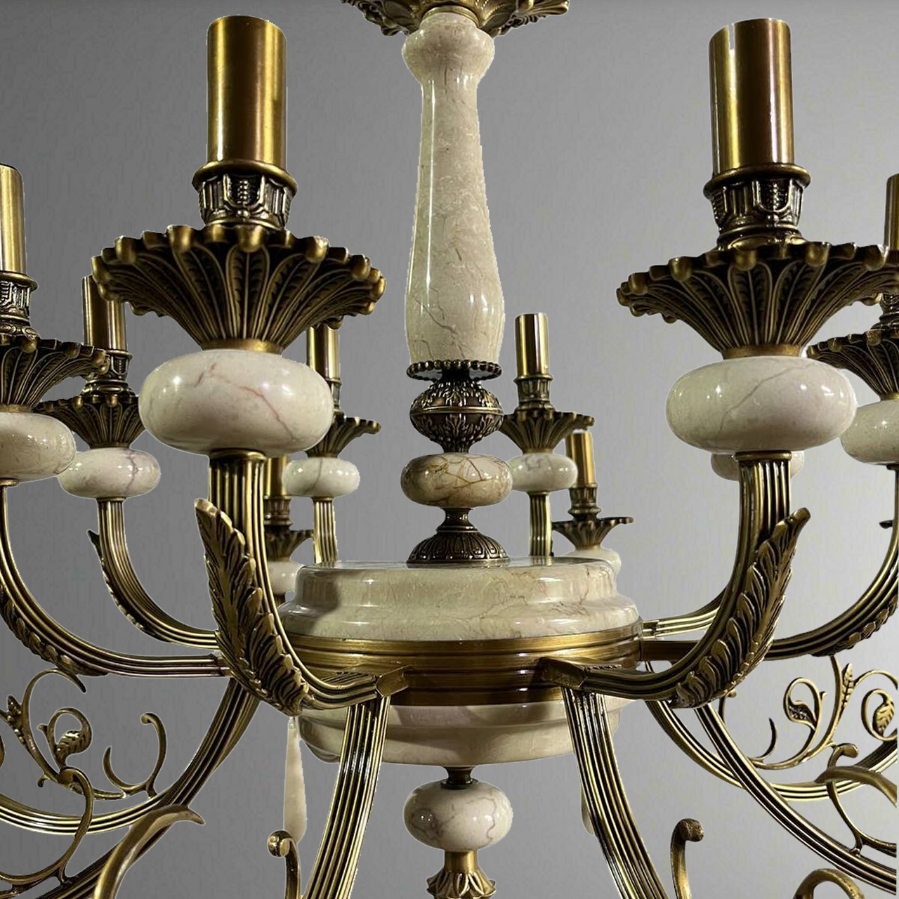 لوستر ۱۶ شعله چشمه نور کد E4915/8A با طراحی مجلل و تلفیق مواد طبیعی و فلزات گرانبها، جلوهای منحصر به فرد و باشکوه به هر فضایی میبخشد. بدنهی اصلی لوستر از ترکیب برنج و سنگهای زینتی ساخته شده است که در کنار هم، حسی از اصالت و استواری را تداعی میکنند. فلز برنج با درخشش آنتیک رنگ گرم خود، همواره از عناصر محبوب در دکوراسیون کلاسیک بوده است و اینجا نیز بهعنوان پایهای برای طراحی اصیل و مجلل این لوستر به کار رفته است. در کنار برنج، سنگ طبیعی با رنگ کرم جذاب به زیبایی هرچه بیشتر این لوستر افزوده است و آن را به یک اثر هنری تبدیل کرده است. کاربرد سنگ طبیعی در این لوسترها نه تنها باعث می شود این لوستر با سبکها و دکوراسیونهای مختلف هماهنگ شود، بلکه به عنوان یک عنصر رنگی در فضا عمل کرده و به آن عمق و جذابیت میبخشد.سنگ کرم با ظاهری ساده و لطیف، حس آرامش را به محیط انتقال میدهد و انتخابی مناسب برای فضاهای روشن و کلاسیک به شمار میرود.این لوستر کلاسیک با طراحی ظریف و اصیل خود، مناسب فضاهای بزرگ و لوکس مانند سالنهای پذیرایی، لابی هتلها و اتاقهای نشیمن بزرگ است. ارتفاع این لوستر ۱۰۰ و قطر آن ۹۳ سانتیمتر است. وزن لوستر حدود ۱۶ کیلوگرم بوده و نصب آن به پایههای محکم نیاز دارد. تعداد شعلههای این لوستر ۱۶ عدد است که با سرپیچ از نوع E14 ، نور را بهطور یکنواخت در محیط پخش میکند. متراژ نوردهی این لوستر مناسب فضاهایی با متراژ ۴۰ متر مربع است و به دلیل استفاده از سنگهای طبیعی در کنار برنج با کیفیت، دوام و ماندگاری بالایی دارد.